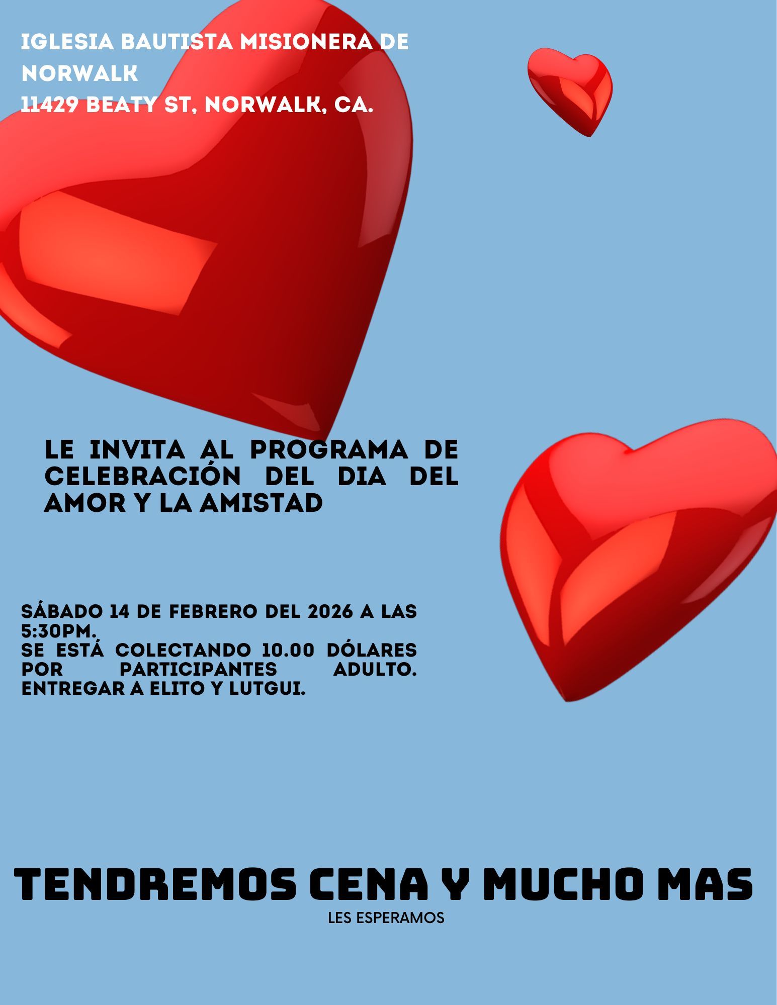 Nuestra Iglesia Bautista Misionera de Norwalk les invita a celebrar con nosotros el dia del Amor y la Amistad este 14 de Febrero a las 5:30p.m.
